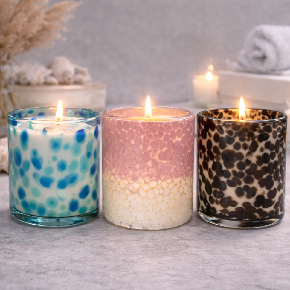 Our Vogue Collection is truly something special. Crafted from hand-moulded glass with a sleek round base, these jars are effortlessly stylish and refined. Each bespoke design adds an extra touch of luxury and creates a stunning effect when illuminated. Due to the hand-moulded nature of the glass, variations in shape, colour, and pattern are to be expected—making every piece uniquely its own.